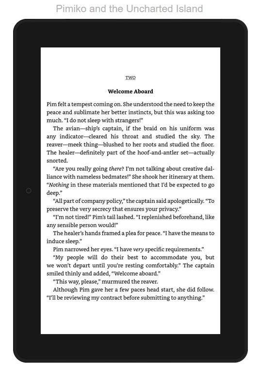 Release Day is October 22. But for those of us who pre-ordered Pimiko and the Uncharted Island on Amazon, the book will likely turn up on our e-readers tomorrow evening. (Mine usually shows up between 9-10pm on Release Eve.) I’ll prep all the usual announcement & squee posts tomorrow, then schedule them. (There’s new art in the offing, too!) In the meantime, here’s another tiny teaser. Pim Moonprowl’s first scene: