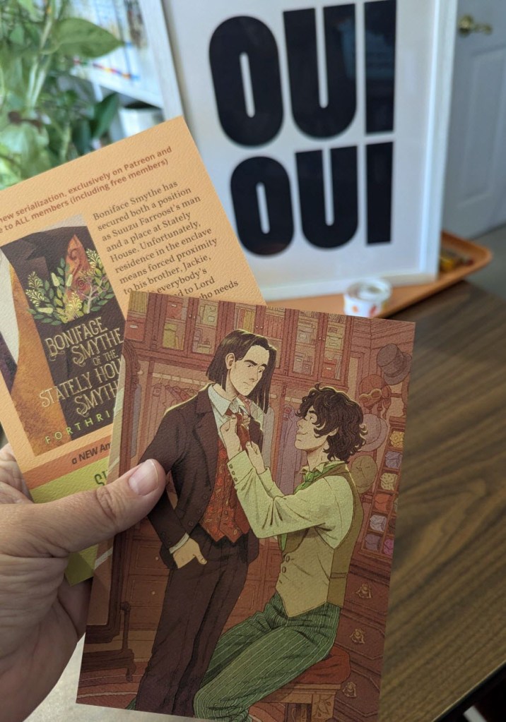 Art Cards & an Audio Drop. To celebrate the debut of my new serialization, Boniface Smythe of the Stately House Smythes, I had Mart Lett create a portrait of Jacques and Boniface. It’s the monthly mailing for October 2025, and on its reverse was a teaser for the brand new Amaranthine Outtake that’s scheduled to drop on November 1.