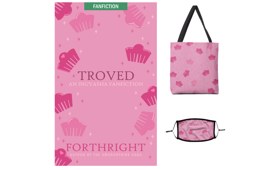 Tuesday’s Tote. Once a week, I’m posting a new fandom book cover to Goodreads & to the fanfic site. As an added bonus, the new pattern is available in my Threadless & TeePublic shopfronts. Totes, masks, backpacks, zipper bags, journals, and note cards are available. This week we’re adding an homage to Troved.