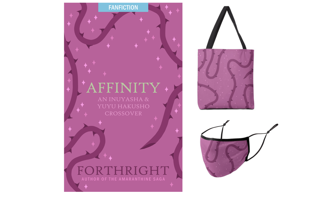 Tuesday’s Tote. (Yes, I’m a day late, but that’s how it goes some weeks.) Every week, I’ve been posting a new fandom book cover to Goodreads & to the fanfic site. As an added bonus, the new pattern is available in my Threadless & TeePublic shopfronts. Totes, masks, backpacks, zipper bags, journals, and note cards are available. This week we’re adding an homage to Affinity.