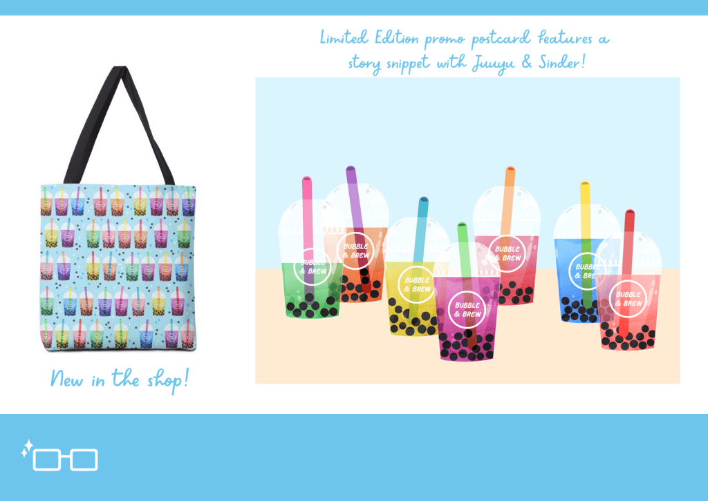 If you’re a patron (or if you ordered a signed book from me), you may have received one of the promotional postcards pictured below, which includes a short story snippet (on the reverse) that takes place in the setting of Fumiko and the Finicky Nestmate. Brew & Bubble is the coffee shop at a local museum/art center, and they serve both coffee & assorted teas (including those boba smoothies I love). The art turned out so cute, we put it on totes! Now available.