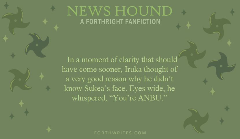 Extra! Extra! For those who ignore author notes & end notes (hey, I know I do), today’s update is the penultimate chapter of News Hound. The fanfic will be complete in 20, so if you’ve been putting off reading the story until it’s done, your wait’s nearly at an end. Although … as it says in the oh-so ignorable end note to Ch19, Iruka’s story isn’t really finished. His ongoing mission will be going on. I’ve already begun writing what comes next in the hopes it’ll be complete before my fanniversary in September. You heard it here first! Look forward to Cub Reporter.